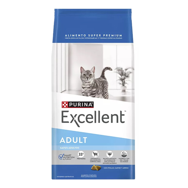 PURINA® Excellent® Adulto Pollo y Arroz, ofrece una fórmula con una óptima combinación de ingredientes, proteínas de alta digestibilidad y ácidos grasos omega 3 y 6, para mantener al máximo la salud del gato adulto.