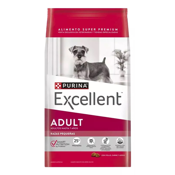 Los perros adultos tienen diferentes necesidades nutricionales que los cachorros o los perros maduros. PURINA® Excellent® Adulto Pollo y Arroz Razas Minis y Pequeñas ofrece una fórmula completa que incluye aminoácidos esenciales, inulina, vitaminas, minerales y zeolita, aportando un óptimo balance nutricional y un sabor irresistible. Condición Corporal Ideal Los perros de tamaño pequeño tienen altos requerimientos proteicos. La utilización de fuentes de proteínas de elevada digestibilidad garantiza el aporte de aminoácidos esenciales que ayudan a mantener músculos fuertes y sanos. Piel Sana y Pelaje Brillante La combinación de los ácidos grasos Omega 6 y 3 junto a vitaminas y minerales favorecen la salud de la piel y un pelaje brillante, primera señal de una salud general adecuada. Óptima Absorción de Nutrientes La inclusión de inulina, un ingrediente de origen natural con función prebiótica, ayuda a optimizar la población de bacterias benéficas en el intestino, colaborando con una mayor salud digestiva, y mejorando la absorción de nutrientes clave como los minerales. Formación de Heces Firmes Una fórmula de alta digestibilidad mejora el aprovechamiento de nutrientes, la inclusión de componentes activos como la zeolita y la fibra de soja ayudan a producir heces firmes.